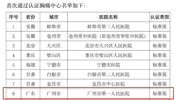 这标志着广州市第一人民医院对急性心肌梗死等急性胸痛疾病综合诊疗水平得到了国家标准的认证。