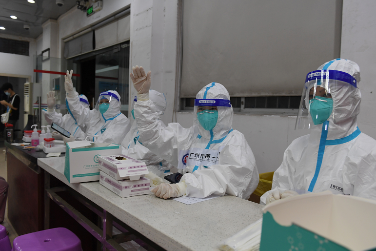 5月26日凌晨,广州市第一人民医院接到紧急任务,需要马上集结一批医务人员到鹤洞开展核酸检测,医院微信群里“一呼百应”,广州市第一人民医院50多名医护人员抵达指定地点现场开展核酸检测。