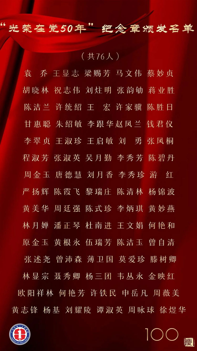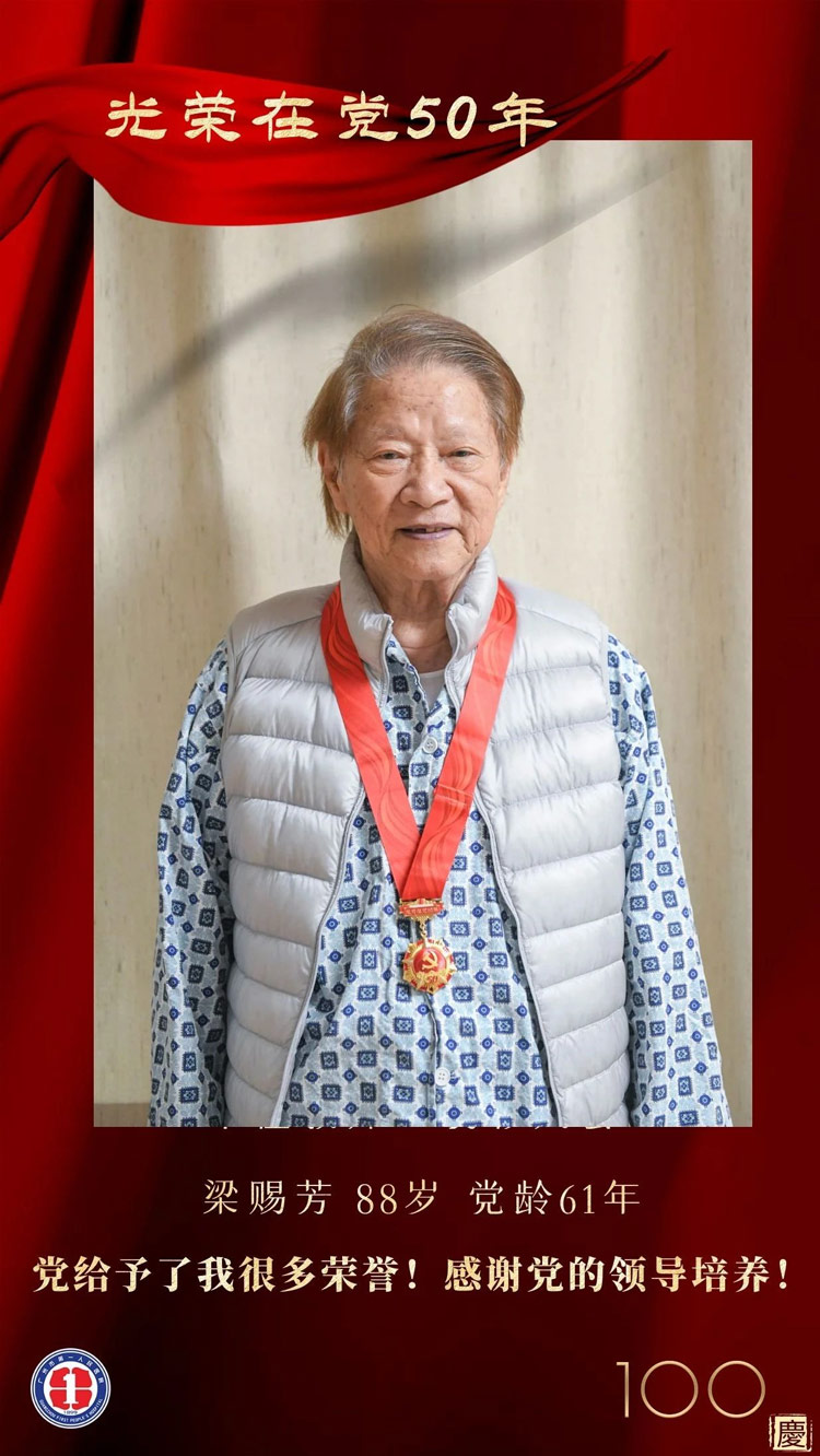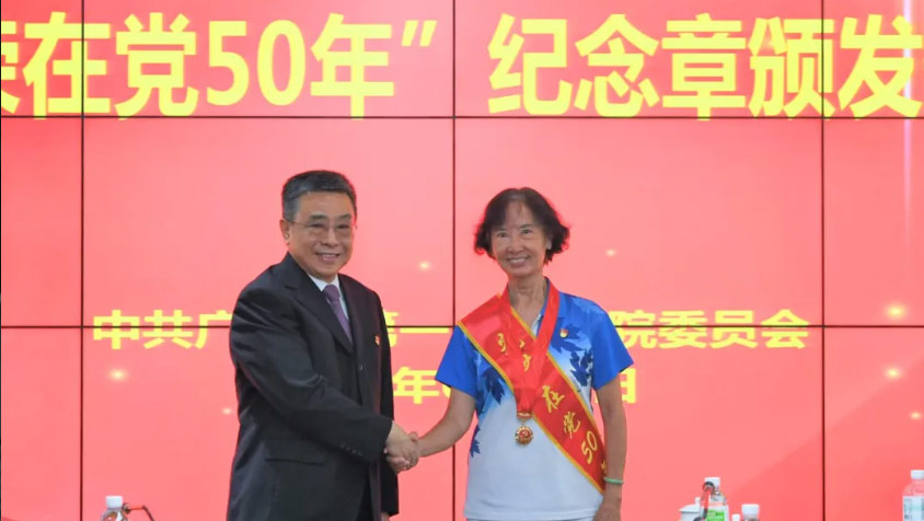 在中国共产党成立100周年之际,党中央决定为党龄50年以上的党员颁授“光荣在党50年”纪念章,这是党中央首次决定颁发“光荣在党50年”纪念章,旨在表达对老党员的政治关怀和尊崇厚待。广州市第一人民医院共有76名老党员符合“光荣在党50年”纪念章颁发条件,曹杰书记上门为其中5位老党员颁发纪念章,并部署其他院领导及总支书记将纪念章一一颁发到位。在76名老党员中,有12位代表回到医院,重返工作故地,在医院接受纪念章的颁发。光荣在党,荣耀依旧。