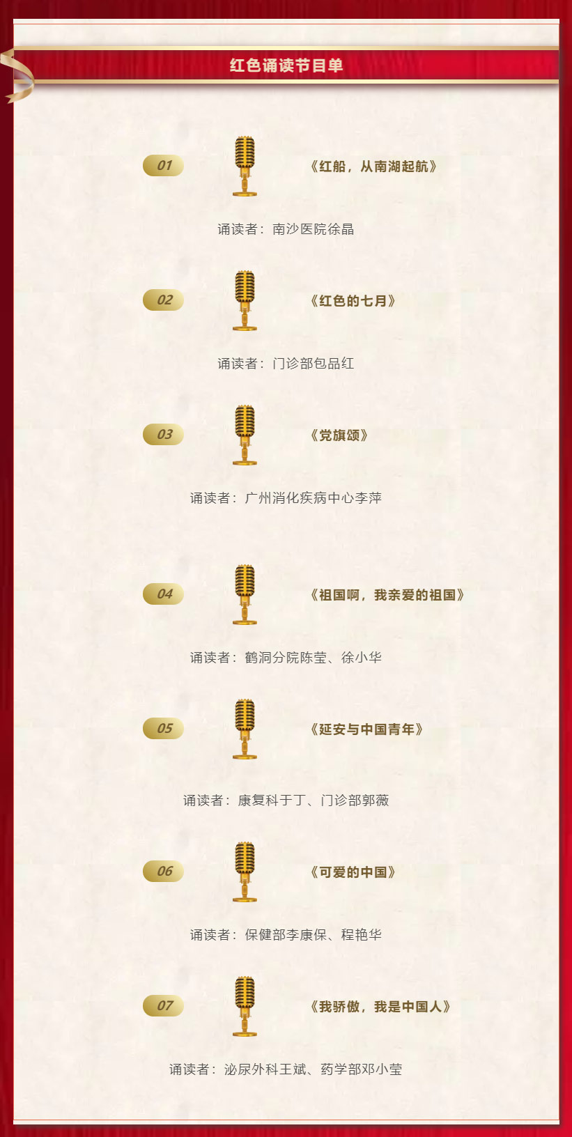 此次诵读会特邀医院职工作为诵读嘉宾,充分利用线上学习阵地,推出“诵读红色经典 传承红色基因”系列专题,诵读《红船,从南湖起航》《党旗颂》《祖国啊,我亲爱的祖国》《可爱的中国》等经典篇目,营造浓厚的红色经典诵读和学习氛围,一同感悟革命先辈的家国情怀。