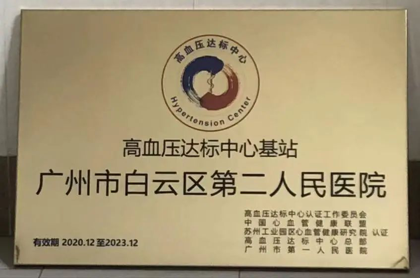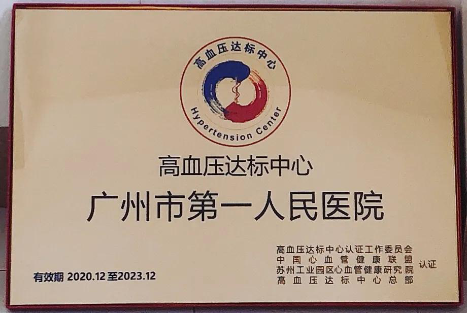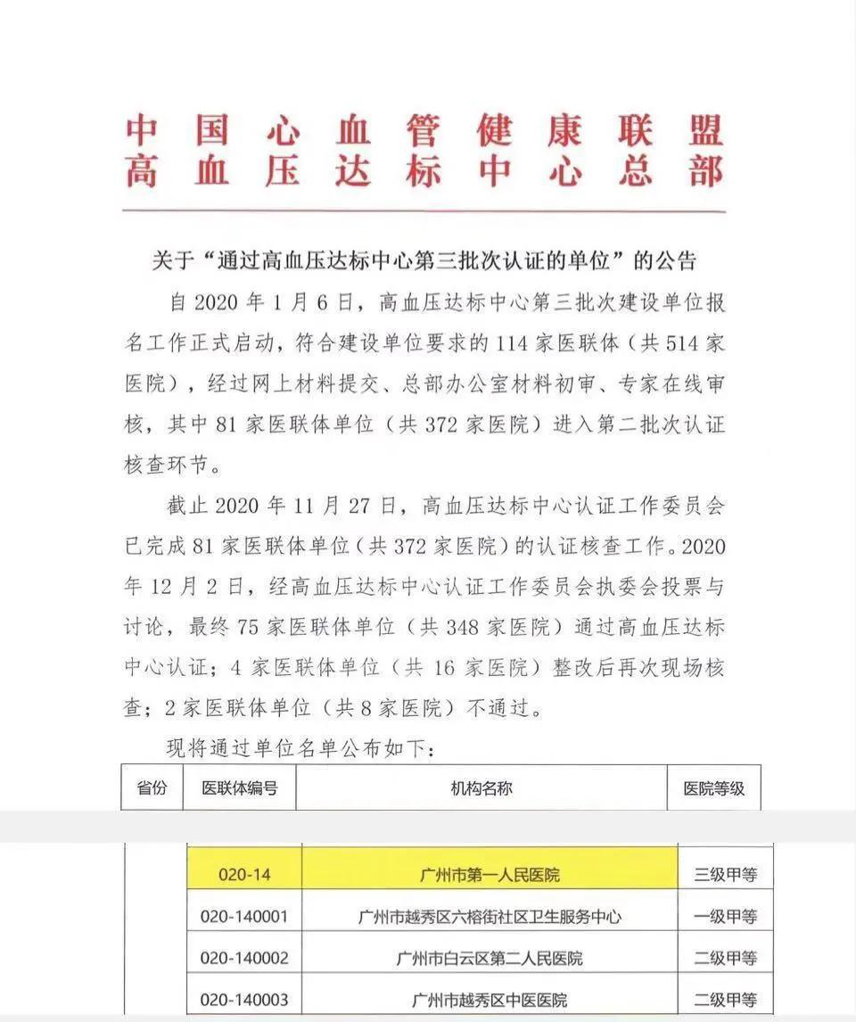 2020年12月2日,经中国心血管健康联盟、高血压达标中心工作委员会执委会投票与讨论,发布《关于“通过高血压达标中心第三批次认证的单位”的公告》,由牵头医院广州市第一人民医院及白云区第二人民医院、越秀区中医医院、六榕街社区卫生服务中心三家卫星医院组成的医联体单位顺利通过国家“高血压达标中心”认证。
