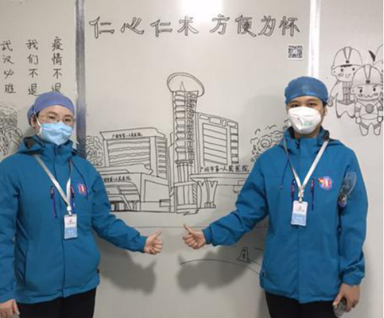 ✿董翠(左一)和队友在雷神山通道画画