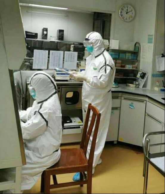 大年二十九晚,实验室迎来了首批新型冠状病毒核酸检测,实验由陈斌副主任技师、吴银霞技师合作完成。防护服、N95口罩、护目镜、卫生帽、鞋套、三层手套,他们“全副武装”进入实验室,从准备工作到实验结束,身穿全身连体防护服进行实验操作衣服湿了又干,护目镜片上雾气凝成水珠挡住视线,精神却要保持高度集中。