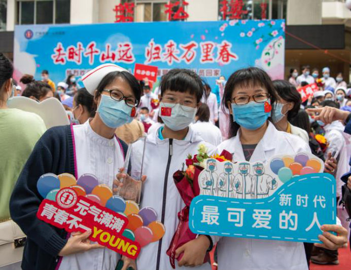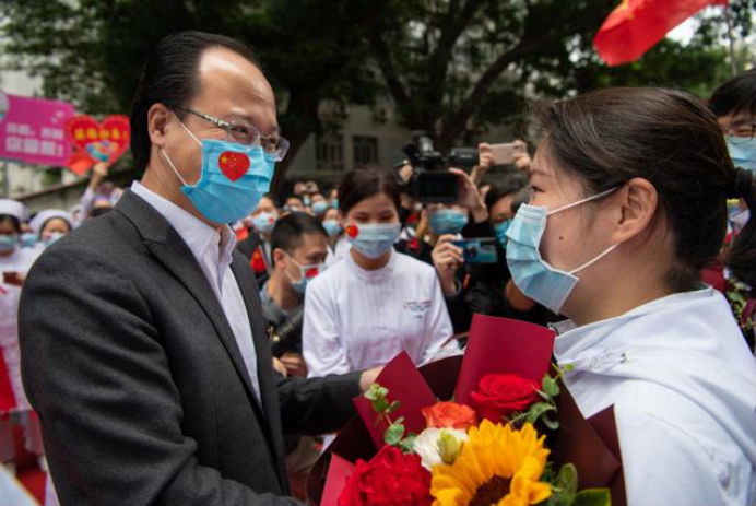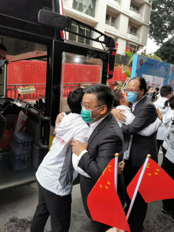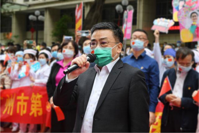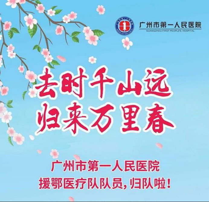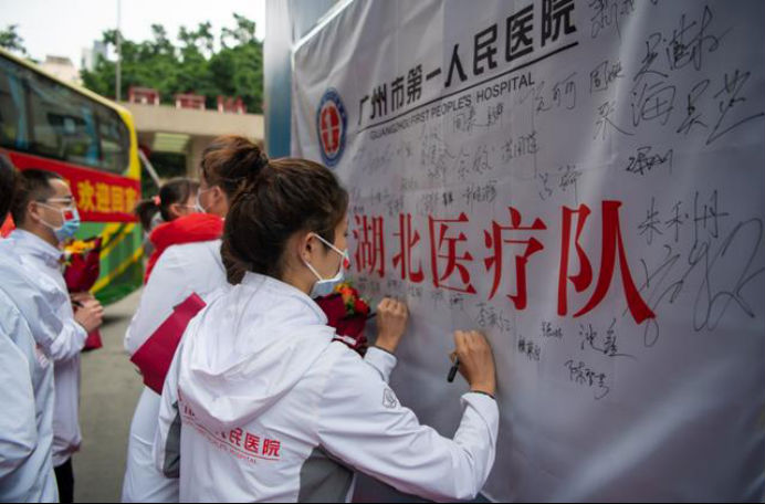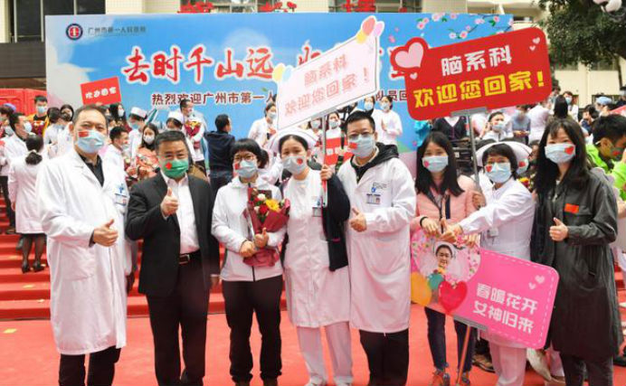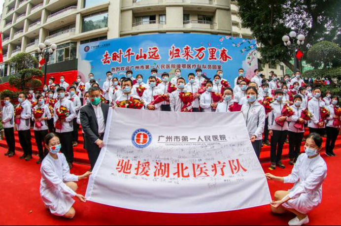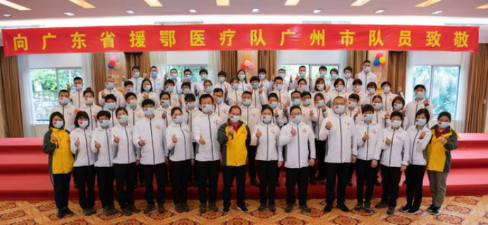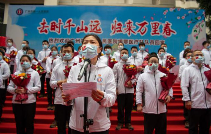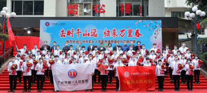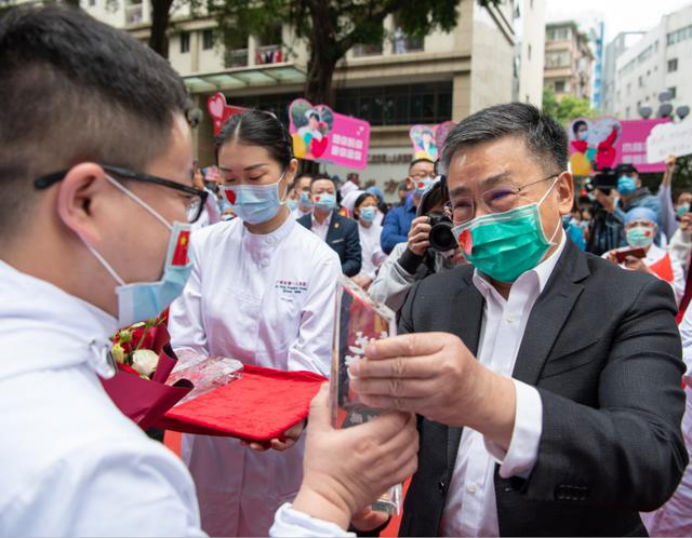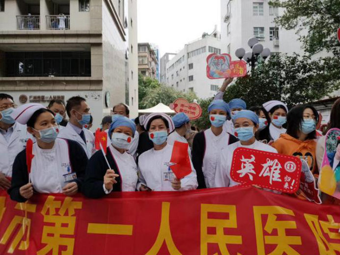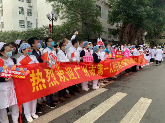 在新冠肺炎疫情最危急的时刻,在祖国最需要的时候,我院的白衣英雄坚决响应习近平总书记和党中央的号召,主动请缨,带着责任和使命,逆行出征、驰援武汉,你们以崇高的医德、精湛的医术、过硬的作风,出色完成了救治任务,弘扬了我院“仁心仁术、方便为怀”的大爱精神。你们剪短的秀发、脸上的勒痕、湿透的衣衫、疲惫的身影,彰显了英雄的缩影。你们是广东的骄傲,广州的骄傲,更是我们市一医院的骄傲!希望援鄂归来,放下荣誉,重新出发,为夺取疫情防控和医院建设发展“双胜利”作出新的更大贡献。