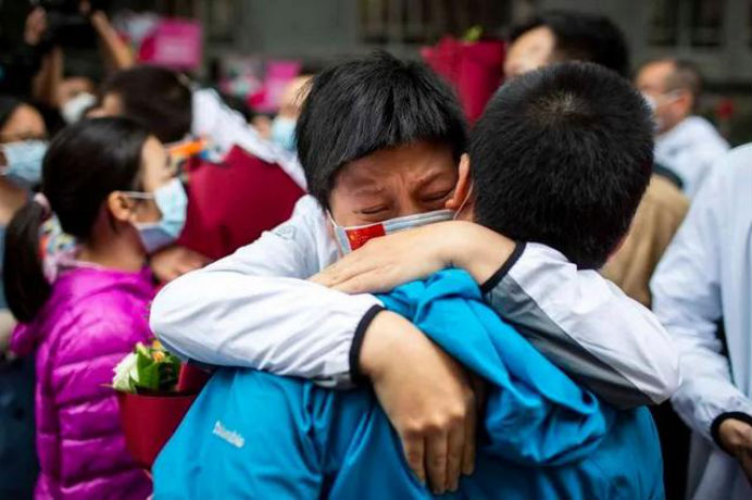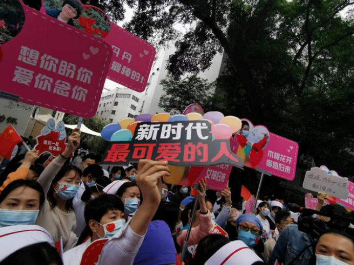 上午11时,人们的眼光不约而同地望向同一个方向,载着58名援鄂队员的车队,缓缓驶进医院大门,欢呼、呐喊,整个会场成了团圆、喜极而泣的海洋。