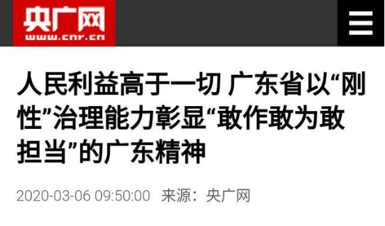 在疫情防控工作中,广东省紧紧围绕“人民利益高于一切”这一宗旨,形成一套研判准、反应快、执行强的“广东打法”,牢牢掌握了“战疫”的主动权,以“刚性”治理能力彰显“敢作敢为敢担当”的广东精神。