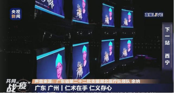 广州市第一人民医院副院长、主任医师余纳和消化内科副主任医师陈慧婷,作为广东“同乡英雄”,在广州猎德大桥、广州国际媒体港、花城广场市二宫、花城汇、海心沙、北京路步行街、流花展馆等地,和其他14座城市的2万张户外大屏中一起,循环闪动,接受来自全国各地市民的敬意,成为城市里一道道温暖又独特的风景。