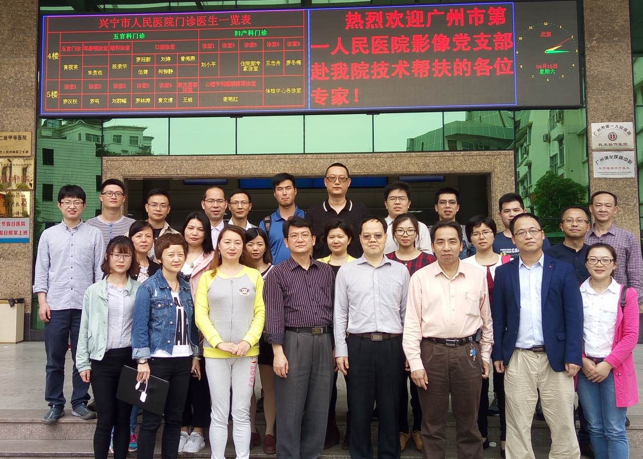 为响应卫计委关于积极改善和提高基层医疗机构服务水平的号召,继续贯彻落实省委省政府关于开展对口帮扶工作的要求,发挥医务职工党员的积极模范作用,我院影像党支部联合广东省医院协会影像专委会,组织一批党员于4月15日前往梅州兴宁市人民医院开展对口帮扶活动。广东省医院协会影像专委会主任委员、我院副院长江新青、医技总支书记胡广奋、影像支部书记刘伟锋以及我院支援兴宁市人民医院挂职副院长赖越元等参加了活动。