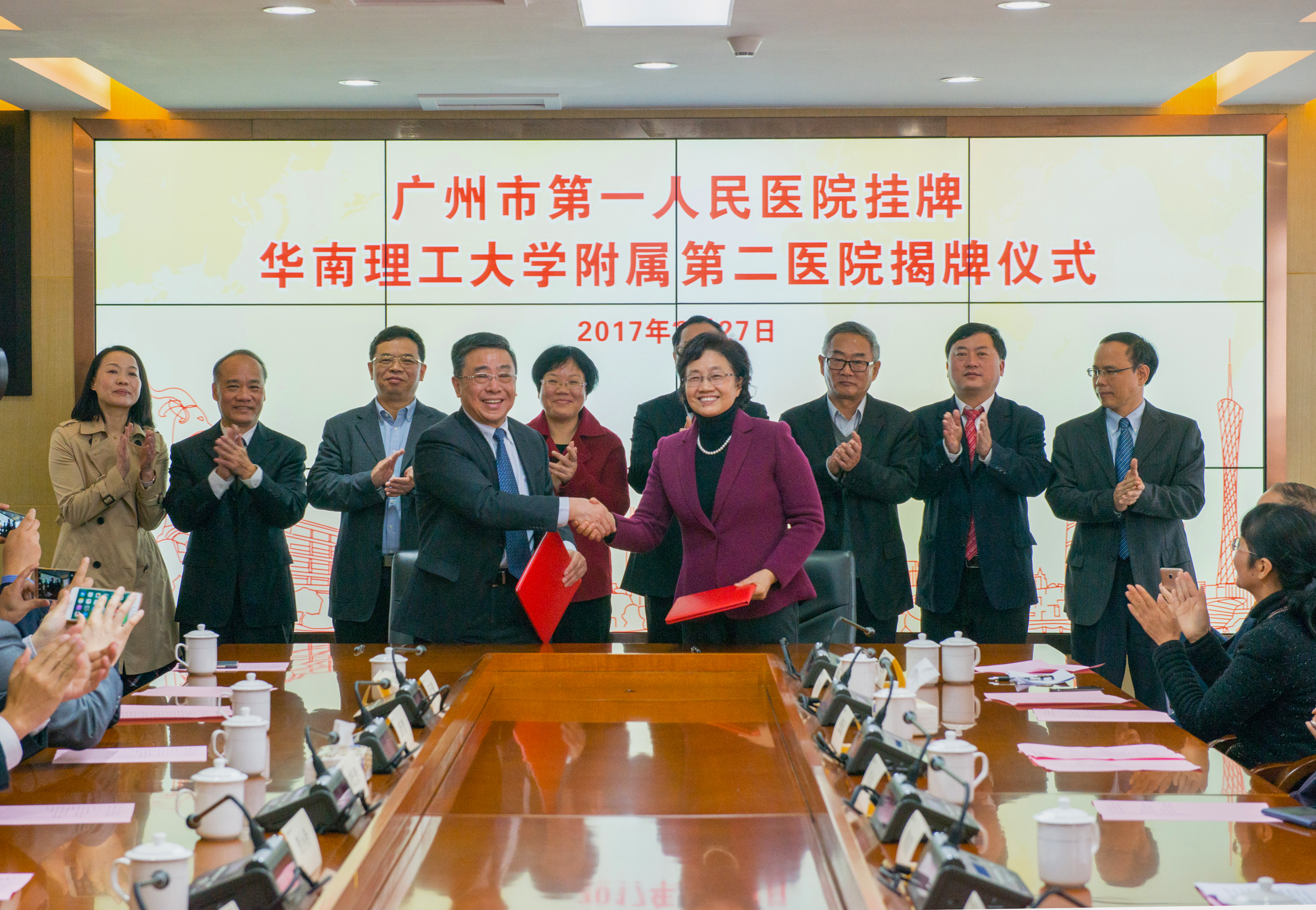 随后,广州市第一人民医院院长曹杰与华南理工大学校长王迎军签订了《广州市第一人民医院与华南理工大学合作协议书》。黎明副市长、马曙副秘书长、唐小平主任、欧阳资文副主任、章熙春书记、王迎军校长、曹杰院长、蒋少艾书记共同为“华南理工大学附属第二医院”揭牌。