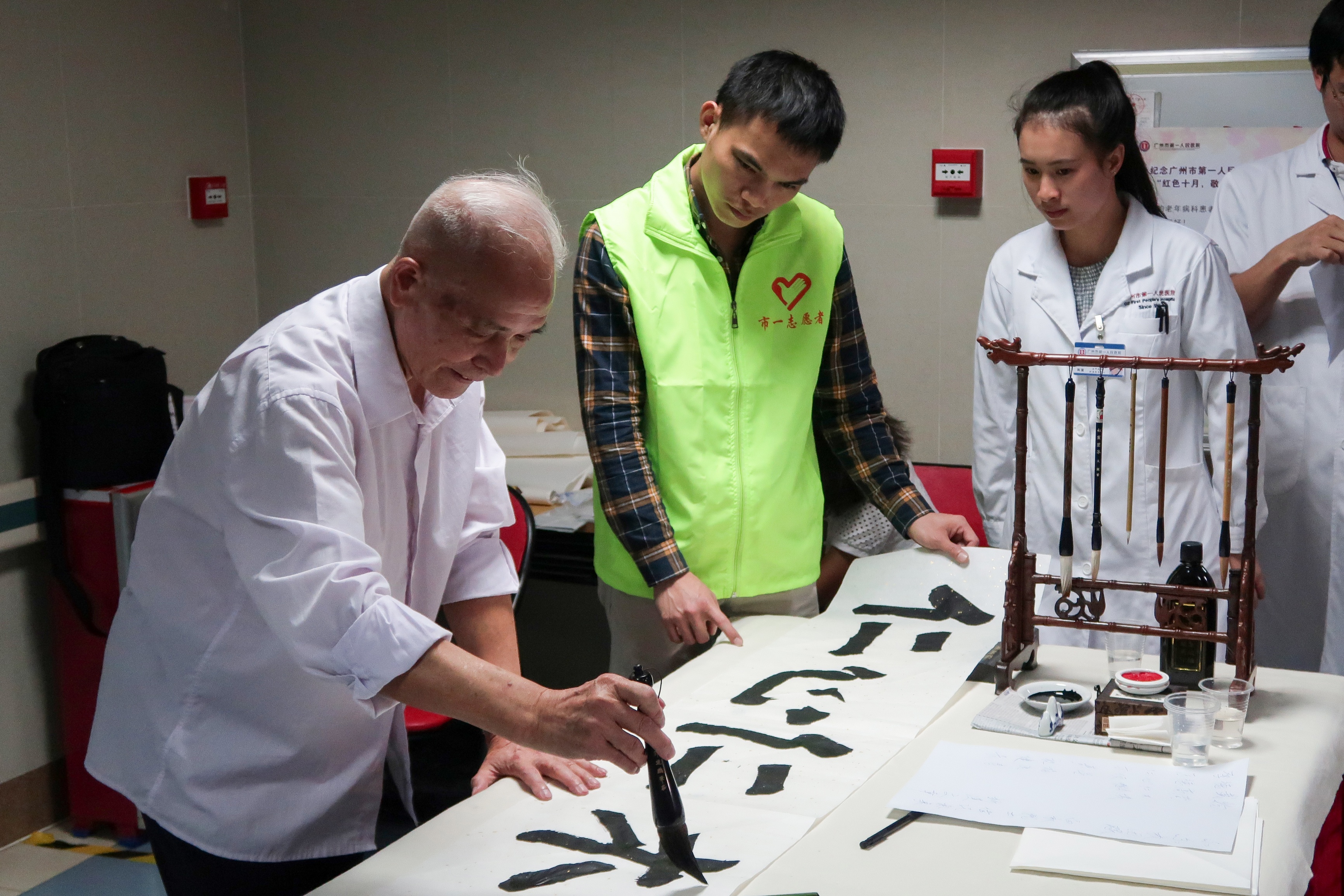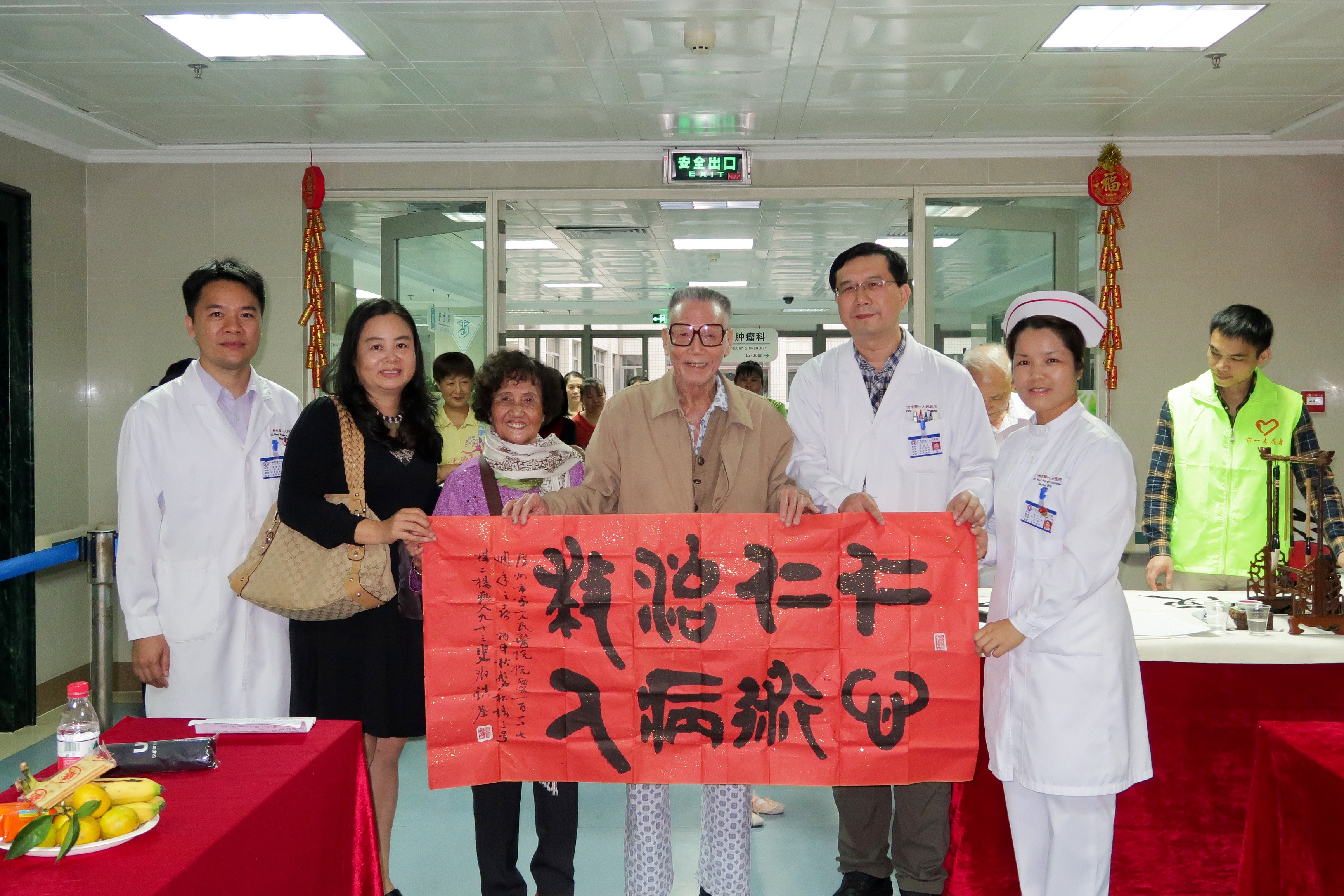 在磐松楼住院的邓老听说今天要开展慰问活动,昨夜挥笔写下仁心仁术 治病救人这幅书法作品,送给老年病科的医务人员,同时作为即将迎来117周年院庆的礼物送给医院。邓老现场还与潘老一起即兴创作书法作品,两位老人的书法遒劲有力、各具韵味,字里行间也体现了对医院的高度赞扬和充分肯定。