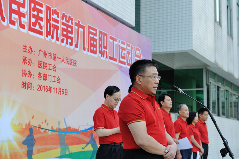 曹杰院长致开幕词,代表医院领导班子对运动会的举办表示热烈的祝贺,对全体运动员、裁判员、后勤工作人员表示衷心地感谢,希望运动员赛出风格、赛出水平、赛出市一人的精神风貌,宣布广州市第一人民医院第九届职工运动会正式开幕。