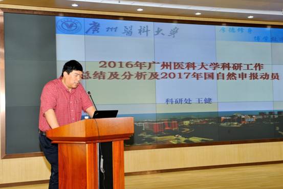 王健处长首先做了《2016年广州医科大学科研工作总结及分析及2017年国自然申报动员》的演讲。他提出广州医科大学在高水平大学建设中迎来了宝贵的发展机遇,也面临巨大的挑战,强调每个人都要有危机意识,不进则退。他还详细介绍了国家自然科学基金的种类、申报流程、如何写好标书等。最后他希望科研工作者能多尝试,不怕失败,祝愿市一医院能百尺竿头更进一步,争取有新的突破。