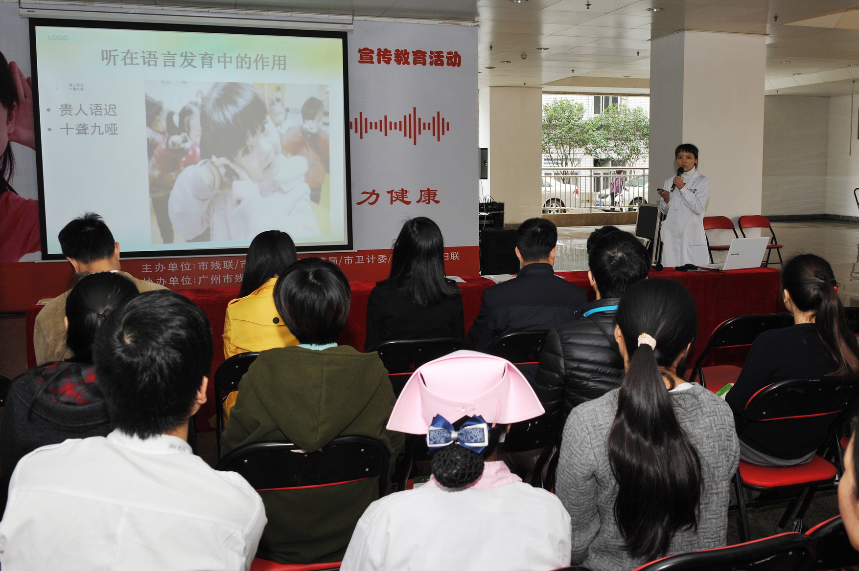 本次“爱耳日”活动主要由健康宣讲、互动环节及现场咨询三部分组成,旨在提高市民对儿童听力的关注,做到听力残疾早发现、早预防和早康复。首先,广州市残联副理事长张扬代表主办方致开幕辞,提出儿童听力健康对儿童成长发育的重要作用。随后,在健康宣讲环节中,我院耳鼻喉科刘文婷主治医师结合生动形象的PPT,以“沟通,由‘听’开始”为题,为市民讲解听力的重要性。耳鼻喉科宋江顺主任医师以“关注儿童听力健康与新生儿听力筛查”为题,详细地讲解了儿童听力筛查的作用和方法,以及儿童听力预防与听力保护相关知识。