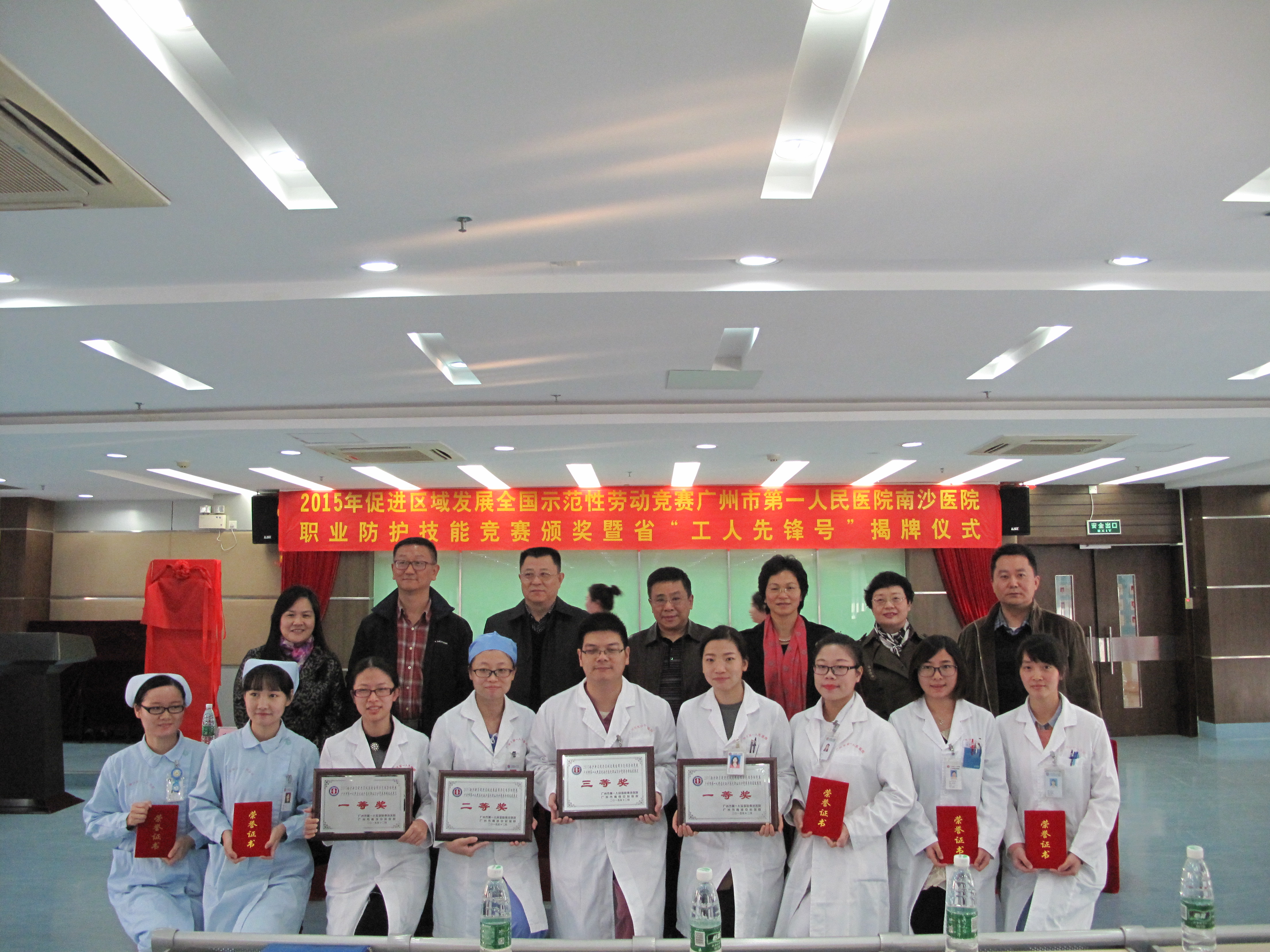 12月18日,我院南沙医院举行了2015年促进区域发展全国示范性劳动竞赛广州市第一人民医院南沙医院职业防护技能竞赛颁奖暨省“工人先锋号”揭牌仪式。南沙区劳动竞赛组委会副主任、南沙区人大常委会副主任、南沙区总工会主席毛鲁泉,南沙区总工会常务副主席梁洁芳,我院曹杰院长、南沙医院全体院领导、工会郭小云主席参加此次颁奖暨揭牌仪式。