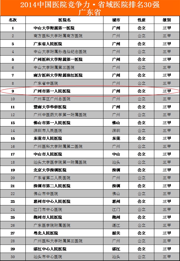 在百强榜发布的同时,香港艾力彼医院管理中心还同时发布了省域医院排名30强。一共有12个省份的前30名医院都排出了榜单。我院名列广东省第九位。