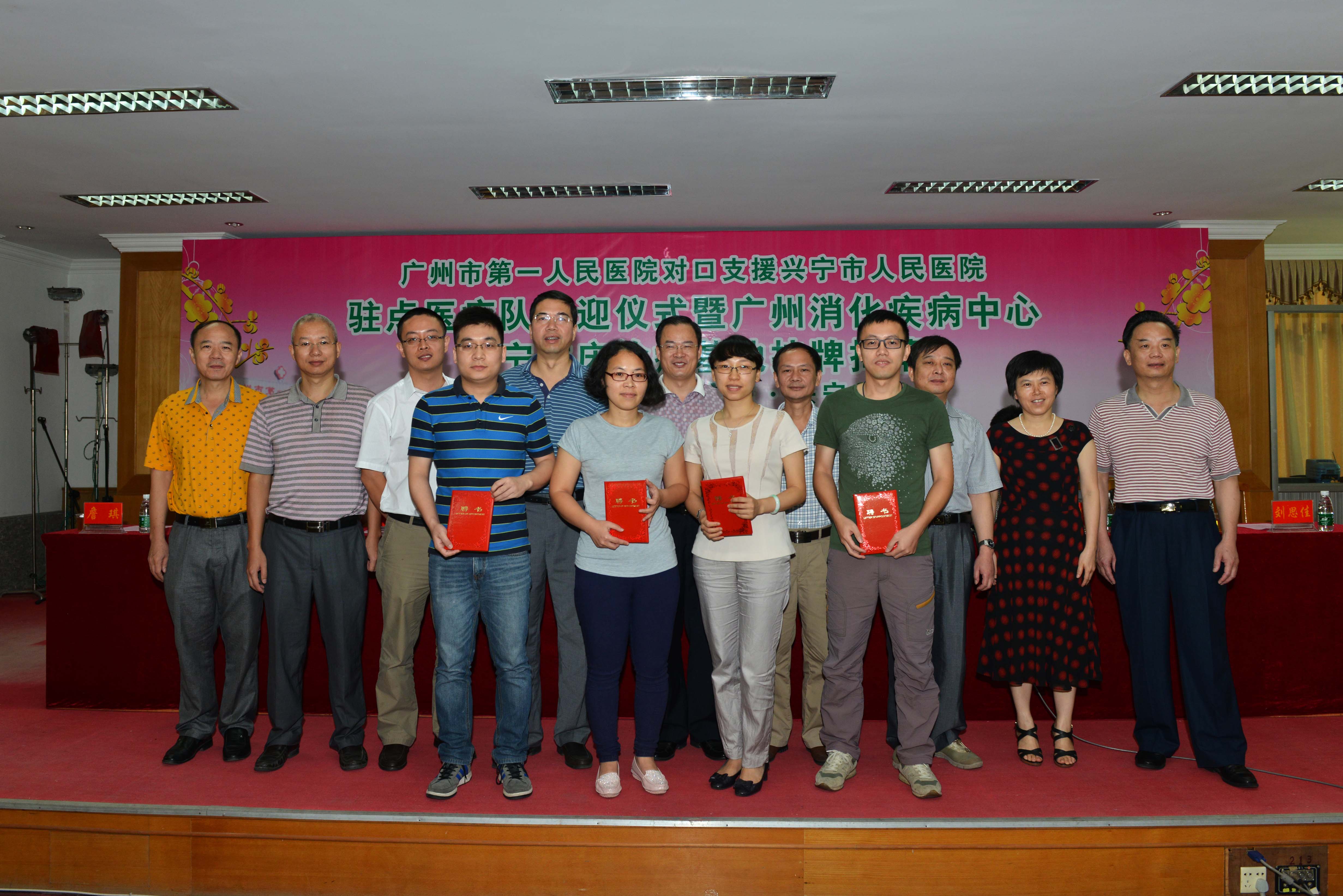 8月6日,医院党委副书记、纪委书记贺小伶,副院长聂玉强带队,医院五个专科青年医生詹琪、林沛茹、陈树达、李宁、龚艳媚以及相关专家组成专业医疗队和部分职能部室负责人一行13人,赴兴宁市人民医院落实为期一年的对口支援工作,同时举行“广州消化疾病中心兴宁临床基地”挂牌仪式。兴宁市人民医院及其上级主管部门,对支医人员的到任高度重视,召开欢迎大会对前来帮扶的专家表示感谢。兴宁市政协副主席郑华、兴宁市卫计局局长练胜红亲自督办支医交接工作。