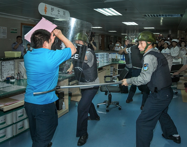 7月23日下午,我院在内科大楼9楼消化内科一区,举行了突发治安事件与火灾事件应急处置的联合演练。医院领导、各层级安全责任人、病区护士长等120余人参加观摩,医院还特别邀请了广州市公安局及越秀区公安分局、解放北消防中队、六榕派出所和综治委领导现场指导。