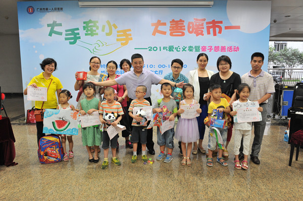 5月31日,一场汇集爱心的慈善义卖会在我院举行。值此“六一国际儿童节“来临之际,医院团委、工会联合举办“大手牵小手大善暖市一”——2015爱心义卖暨亲子慈善活动,为我院14周岁及以下的住院患儿送上一份爱的礼物。本次活动活动吸引了广州市外办和广州市捷思实业发展有限公司的爱心物品资助和参与,共筹集善款6258元,其中捐款1041元,全部捐给由我院与广州市慈善会联合创立的“再生援--重型再生障碍性贫血患者救治基金”。6月1日儿童节当天,医院曹杰院长、蒋少艾书记、贺小伶副书记探望儿科病房的孩子们,并送上义卖活动当天爱心制作和捐赠的礼物。