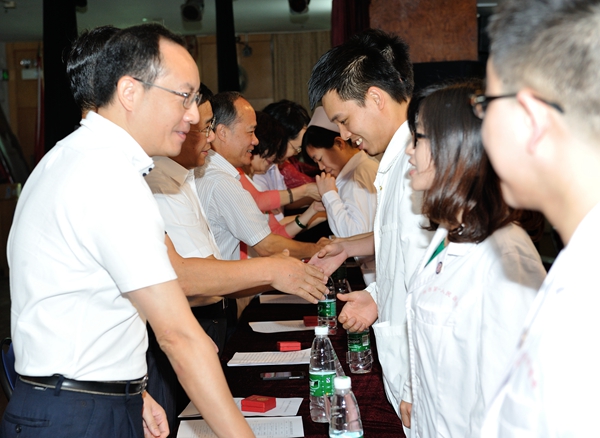 10月22日至24日,我院在广州医科大学体育馆举行了为期三天的2014年新入职员工岗前培训班,全院新招聘职工、专科医师培训学员共394名新入职人员,参加了此次培训。全体院领导为新职工代表佩戴了院徽。