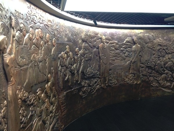 揭牌仪式后,参观人员满怀期待的踏进了院史馆,扑面而来的是古朴文雅的历史气息,城西方便医院的石碑、每天迎送我们上下班的古钟……最为令人精神一振的是一幅将城西方便所以来百年市一有代表意义的重大事件一一重现的大型浮雕。从这幅浮雕,我们看到了一条历史的河流,从城西方便所发源,到广州市第一人民医院的奋起,历经百年,医院与民族共命运,与时代同进步。浮雕《方便长河》用319公斤紫铜作材料,全部由人工敲凿,历经八个月而成,由著名画家、中国美术家协会会员、广东省美术家协会常务理事、广州市美术家协会副主席、岭南画坛的领军人物、广州大学美术学院院长汪晓曙教授创作,雕塑家程一峰老师精心制作。