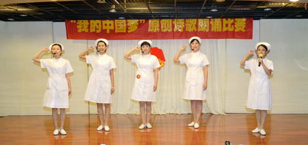 表 彰大会后进行了我的中国梦”原创诗歌朗诵比赛决赛,我院进入决赛的两只队伍均获得好成绩:由护理部、团委联合选送的配乐诗朗诵《芳心予人—白衣天使的梦》 获得一等奖(作者:蔡丹嬿、蒋少艾,表演者:李萍、陈翠萍、王芳、苏思安、谭夏侃),团委选送的配乐诗朗诵《行走在梦的路上》获得二等奖(作者:林永双、 徐晶,表演者:谭夏侃)。