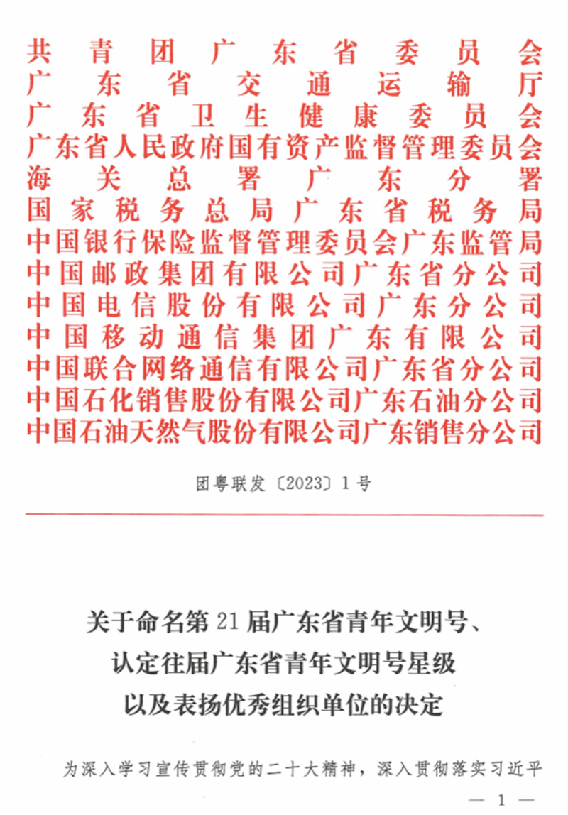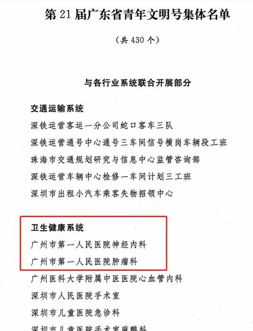 近日,第21届广东省青年文明号集体评选结果揭晓,广州市第一人民医院神经内科、肿瘤科2个优秀青年集体,被认定为广东省青年文明号。