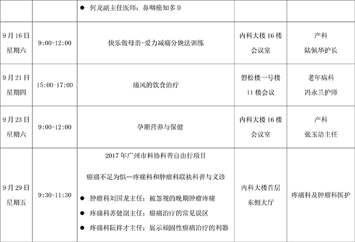2017年9月健康教育讲座安排