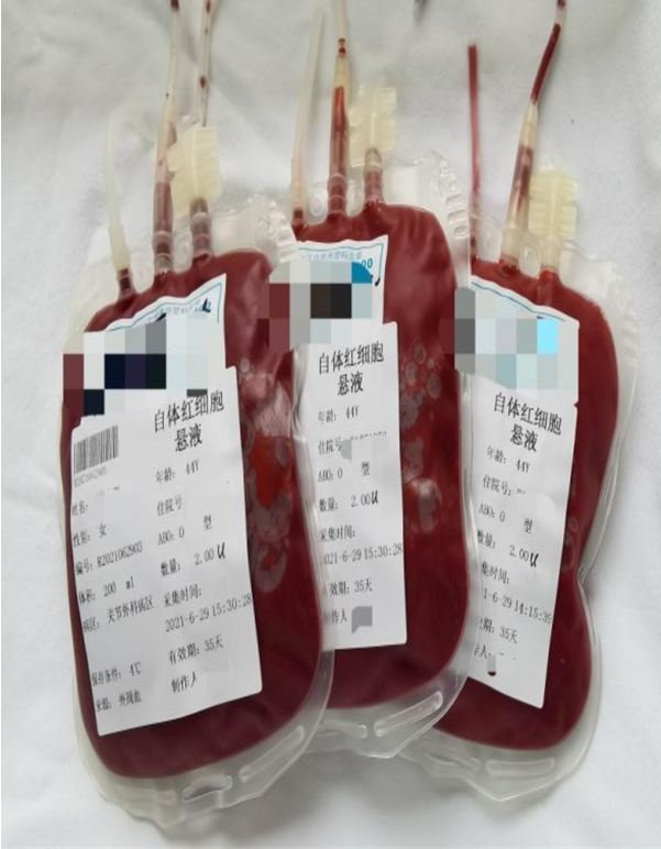 接到临床用血会诊请求后,输血科魏亚明主任与黄建云主任医师查阅患者病历与相关检验结果,提出了应用深度自体单采技术为患者储存自体红细胞6单位的方案+异体血的用血方案,减少异体红细胞使用量。