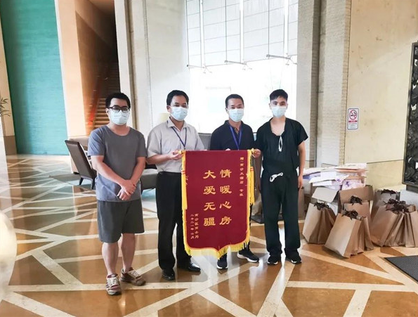 6月15日,南沙区商务部为南沙医院驻点医疗队赠送了锦旗。南沙大酒店获得全区隔离酒店综合排名名列前茅。在多次上级部门的感染防控检查中,南沙医院医疗队的工作都受到了肯定。南沙医院编印的《南沙区隔离酒店“亚病房管理”手册》受到董可区长、江效民副主任和邓腊局长的好评,准备刊印进行全区推广。