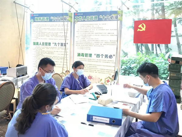 区文弢队长和肖伟临时党支部书记率领医疗队员每天为隔离人员进行核酸采样、多系统疾病的医学诊疗及健康管理、提供心理辅导。无惧苦累,短短一周内,已服务隔离人员共306名,为126名隔离人员提供医疗服务,核酸采样数千次。
