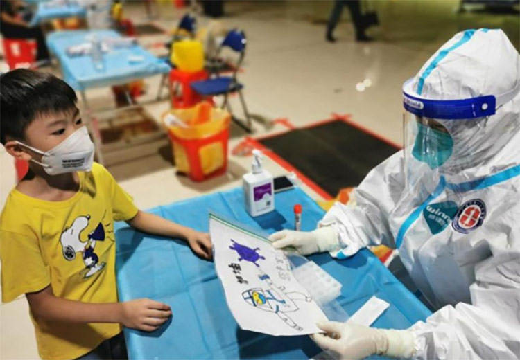 6月1日晚上10点,在荔湾区西郊场核酸采集点,一个小朋友在采完核酸以后,拿出精心准备的一副画,郑重地送给了广州市第一人民医院90后护士黄凯丽,画上是一名穿着防护服的医务人员正在击退病毒。“姐姐,你们辛苦了!”