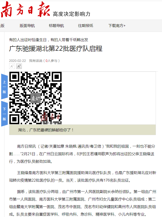 《南方日报》:广东驰援湖北第22批医疗队启程 2020年2月22日A07版