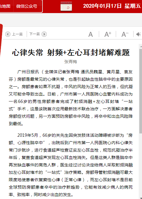 《广州日报》:心律失常 射频+左心耳封堵解难题 2020年1月17日A24版