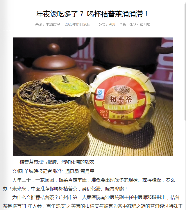 《羊城晚报》:年夜饭吃多了? 喝杯桔普茶消消滞! 2020年1月26日A8版