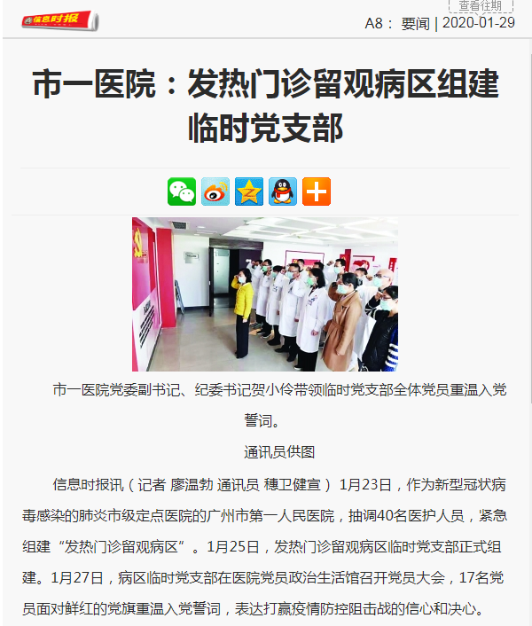 《信息时报》:市一医院:发热门诊留观病区组建临时党支部 2020年1月29日A8版