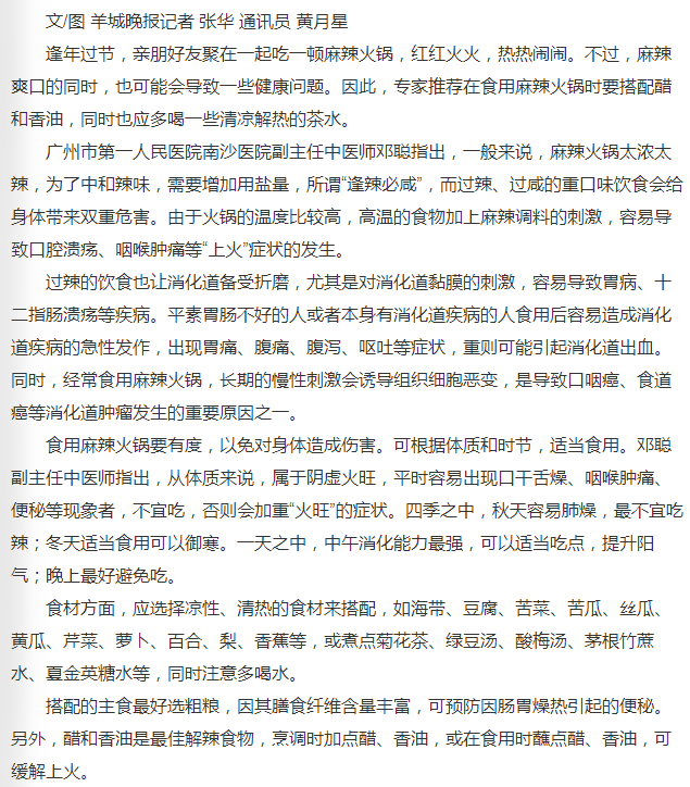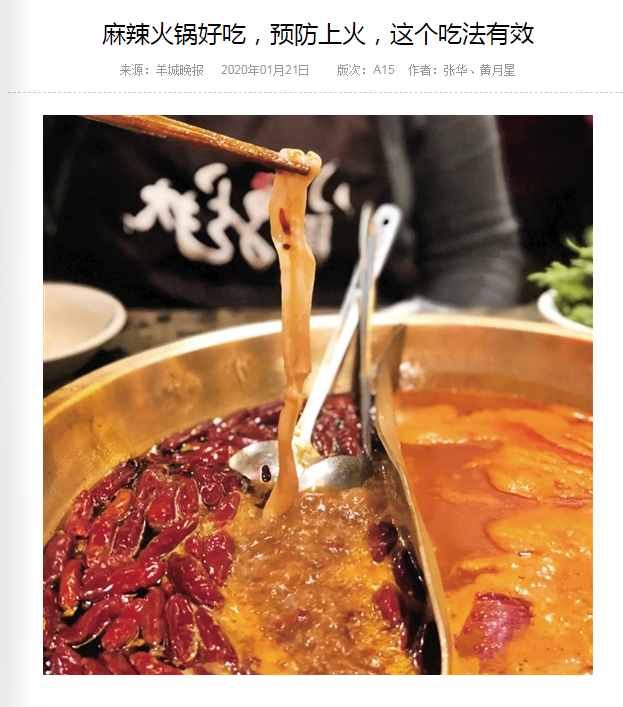 《羊城晚报》:麻辣火锅好吃,预防上火,这个吃法有效 2020年1月20日A15版