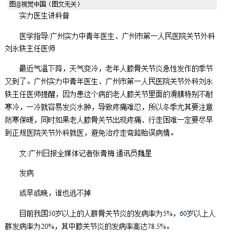 《广州日报》膝骨关节炎 错过最佳治疗期还有这个好办法2019年12月11日A16版