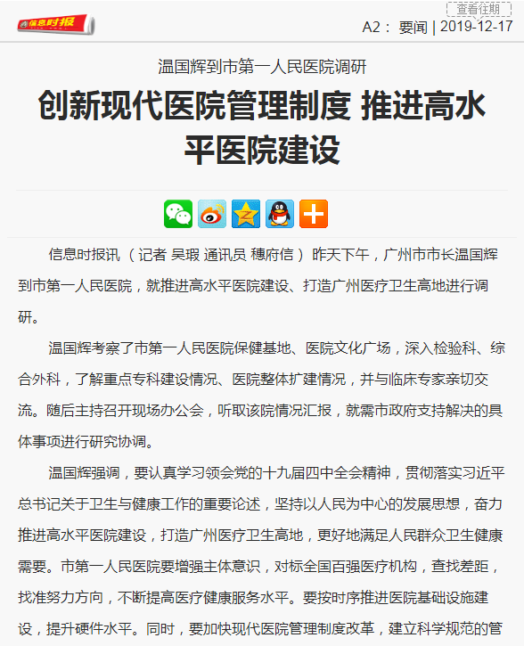 《信息时报》创新现代医院管理制度 推进高水平医院建设2019年12月17日A2版
