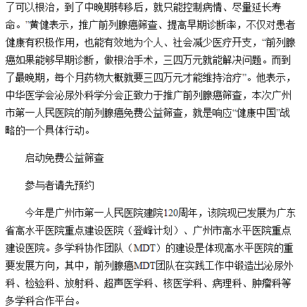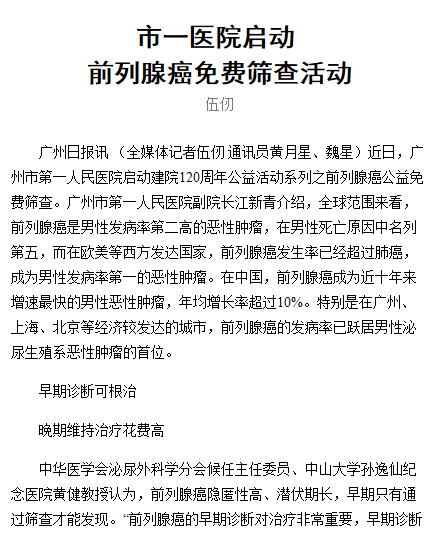 《广州日报》市一医院启动前列腺癌免费筛查活动2019年11月8日A24版