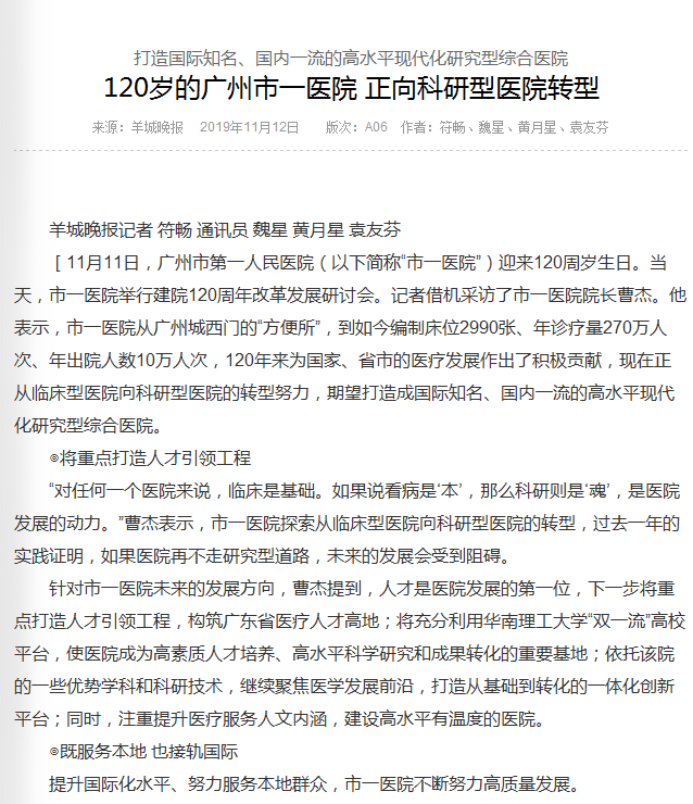 《羊城晚报》120岁的广州市一医院 正向科研型医院转型2019年11月12日A06版