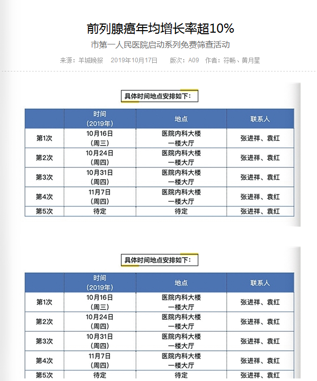 《羊城晚报》"前列腺癌年均增长率超10% 市第一人民医院启动系列免费筛查活动"2019年10月17日A9版