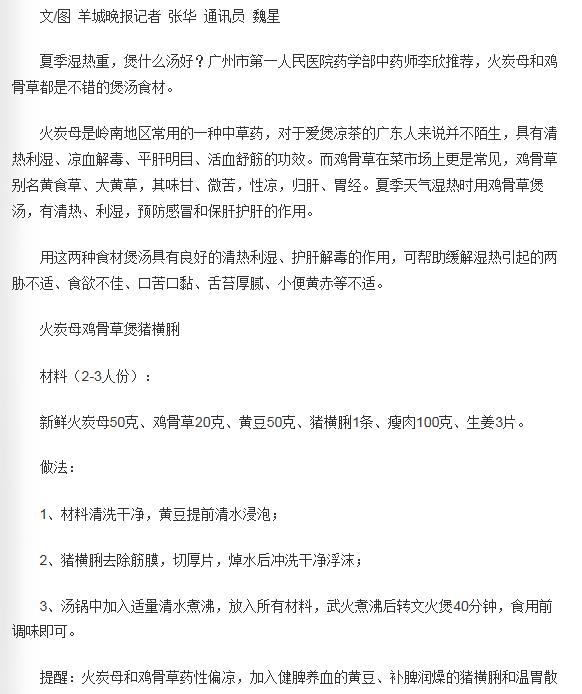《羊城晚报》:一碗火炭母鸡骨草煲猪横脷 暑湿热退 2019年6月18日A14版