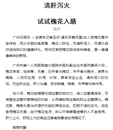 《广州日报》:清肝泻火 试试槐花入膳 2019年5月8日A16版