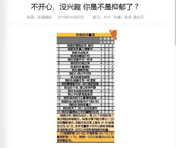 《羊城晚报》:不开心、没兴趣 你是不是抑郁了? 2019年4月2日A14版