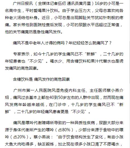 《广州日报》:高中生痛风发作老火汤和含糖饮料是祸首 2019年4月10日A16版