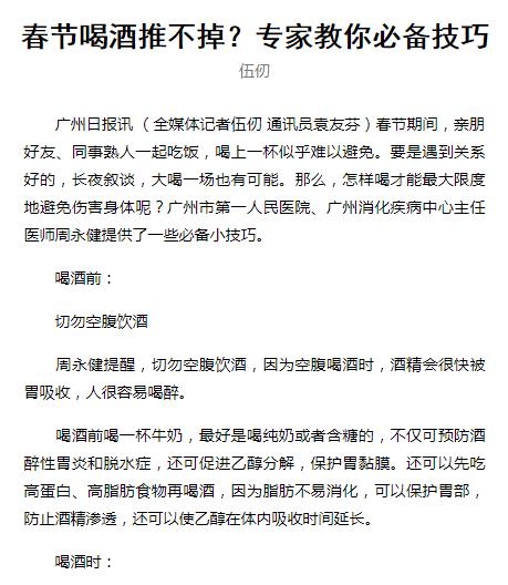 《广州日报》:春节喝酒推不掉?专家教你必备技巧 2019年2月15日A23版