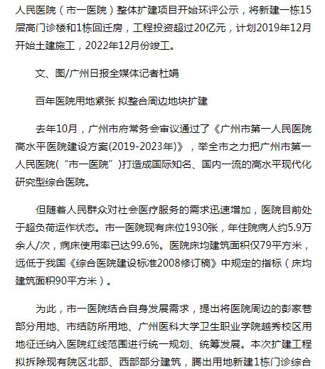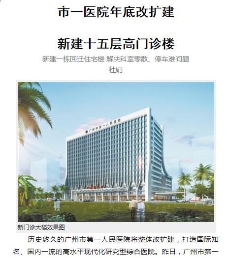 《广州日报》:市一医院年底改扩建 新建十五层高门诊楼 2019年2月20日A8版
