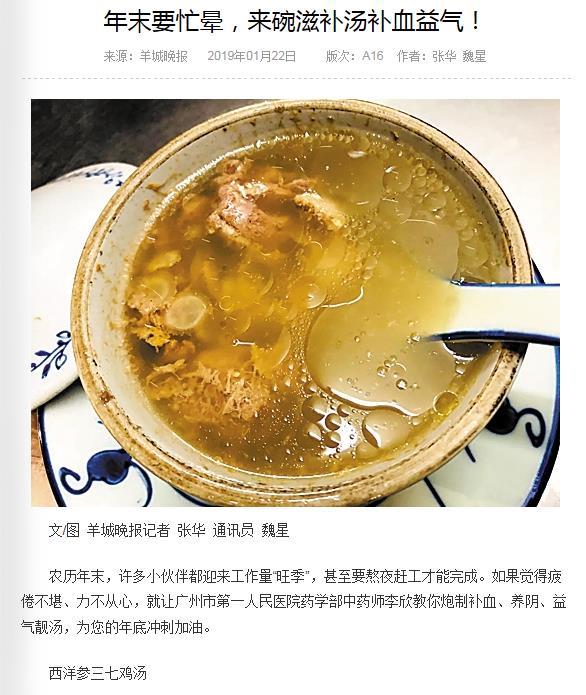 《羊城晚报》:年末要忙晕,来碗滋补汤补血益气! 2019年1月22日A16版