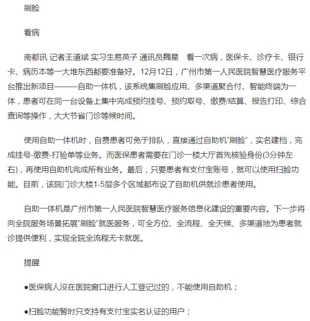 《南方都市报》:市一医院自助一体机上线 2018年12月12日GA03版