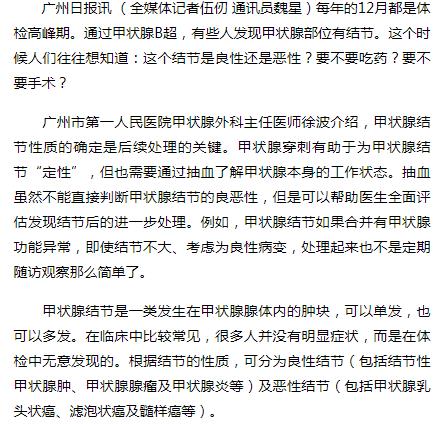 《广州日报》:体检发现甲状腺结节怎么办? 2019年1月9日A23